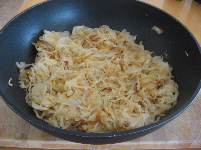קוצצים את הבצל לרצועות דקיקות ומטגנים בחמאה עד להזהבה