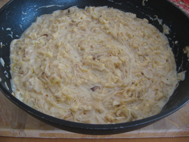 מוסיפים לבצל את הביצים, הגבינות והשמנת המתוקה, מתבלים במלח ובאגוז מוסקט מגורר